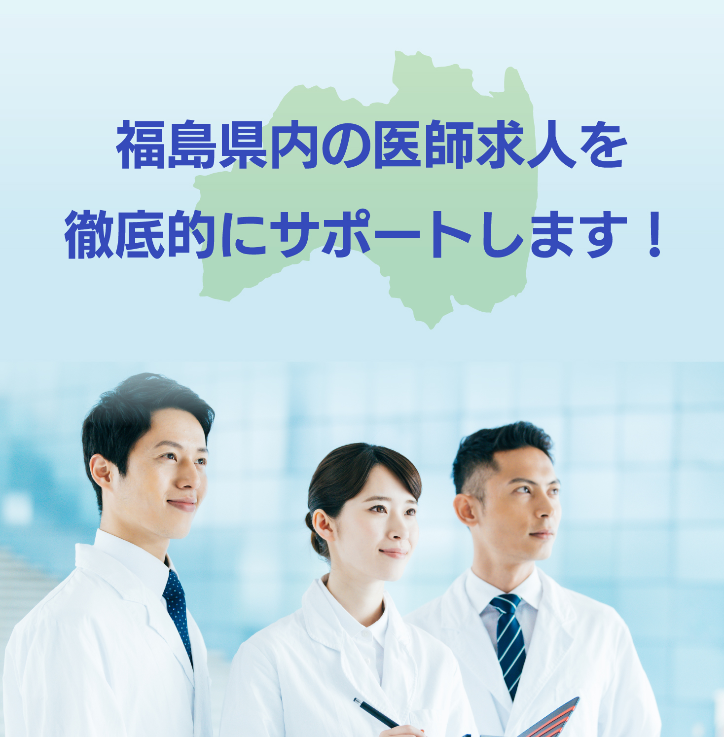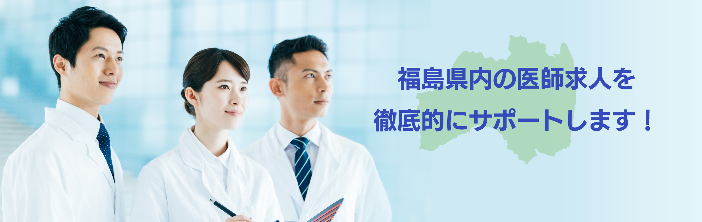 福島県内での勤務を希望される医師の皆さまと福島県内の医療機関を“つなぐ”ため、福島県が実施する事業※で、雇用契約の成立に向けて、求人・求職情報の紹介、斡旋、相談等を無料で行います。 ※ 職業安定法第33条の4に基づき地方公共団体が行う無料職業紹介事業